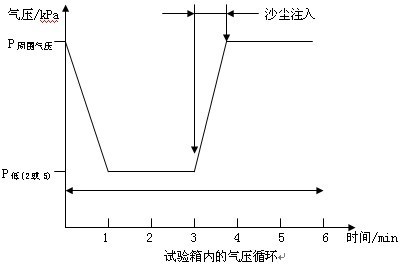 試驗用塵:試驗用塵是干燥的非磨蝕性的細(xì)粉塵,能夠通過篩孔為75µm,金屬絲直徑為50µm的平面網(wǎng)狀篩。本試驗中可以使用滑石粉,分析表明它可以滿足要求。試驗用塵使用次數(shù)不應(yīng)超過20次。應(yīng)注意維持干燥以保持粉塵細(xì)度,使用前應(yīng)在80℃下烘干2h. 塵濃度:試驗用塵的數(shù)量應(yīng)能夠使箱底基準(zhǔn)表面上的沉降量均勻維持在(600±200)µ/(m²•h)。 氣流:試驗箱內(nèi)的氣流應(yīng)主要是自上而下的垂直氣流,而非層流。 氣流速度:氣流速度應(yīng)能夠使塵在試驗箱內(nèi)均勻分布。 濕度:試驗箱內(nèi)的相對濕度應(yīng)小于15%。可以通過提高試驗箱濕度實現(xiàn)。 樣品內(nèi)氣壓:根據(jù)樣品的運(yùn)行條件,樣品外殼可以分為兩種類型: 類型1:樣品外殼內(nèi)的氣壓可能會與外界大氣壓不同,例如由運(yùn)行中的熱力循環(huán)引起氣壓不同。 類型2:樣品外殼內(nèi)的氣壓跟外界氣壓相同。 相關(guān)規(guī)范應(yīng)闡明樣品外殼類型和壓力降。 砂塵試驗箱對于具有類型1外殼的樣品,應(yīng)放入試驗箱,并按照正常使用位置安裝。樣品應(yīng)承受圖中規(guī)定的壓降周期。根據(jù)相關(guān)規(guī)范中規(guī)定,壓力降應(yīng)為2kPa(20mbar)或5kPa(50mbar) 。 如圖所示,塵應(yīng)在每個循環(huán)周期內(nèi)注入。 對于具有類型2外殼的樣品,應(yīng)放入試驗箱,并按照正常使用位置安裝。此種情況下,不應(yīng)使用真空泵。