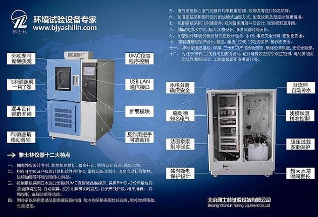 寶劍鋒從磨礪出,梅花香自苦寒來。雅士林儀器持續(xù)創(chuàng)新,開發(fā)最前沿的測試技術(shù),使雅士林的產(chǎn)品肯有更加大的生命力。雅士林儀器定位于中高端客戶群,高品質(zhì)、高性能高低溫交變濕熱試驗箱系列的產(chǎn)品特點: 1、擁有外觀設(shè)計專利,數(shù)控機床剪折、激光開孔,結(jié)構(gòu)設(shè)計合理,新穎美觀。 2、擁有自主知識產(chǎn)權(quán)和計算機軟件著作權(quán),掌握超低溫制冷、溫度自動補償加熱、淺槽加濕等環(huán)境試驗核心科技。 3、控制系統(tǒng)采用日本進口優(yōu)易控UMC系列7英寸高清真彩液晶觸摸顯示屏,溫度控制采用P•I•D+S•S•R系統(tǒng)同頻道協(xié)調(diào)控制,自動演算的功能,支持電腦實時監(jiān)控、歷史曲線回放、程序編輯、遠程診斷等功能。 4、制冷系統(tǒng)采用原裝法國泰康壓縮機組,制冷劑采用美國杜邦品牌,制冷效果強勁,性能穩(wěn)定。 5、電氣系統(tǒng)核心電氣元器件均采用施耐德、歐姆龍等進口知名品牌。 6、加濕系統(tǒng)采用國際流行的淺槽式加濕方式,加濕效果及濕度控制更精準(zhǔn)。 7、照明系統(tǒng)采用飛利浦套件,觀測窗采用漏斗形設(shè)計,觀測視野更開闊。 8、抽屜式加水方式,超大水箱設(shè)計,持續(xù)試驗時間更長。 9、沿襲國外環(huán)境試驗設(shè)備先進設(shè)計理念,水路、電路完全分離,使用更安全。 10、獨有的漏電保護設(shè)計,超溫、超壓、過載、過電流保護,操作更安全。 11、標(biāo)準(zhǔn)化圖紙接線、焊接,三十五項嚴(yán)格檢驗流程,確保設(shè)備質(zhì)量,無安全隱患。 12、專注于細節(jié),引線測試孔防銹設(shè)計、進口硅橡膠密封條雙層密封、高品質(zhì)可固定式PU腳輪設(shè)計、工作室底部引流槽設(shè)計等。 全國免費服務(wù)電話:4006 400 998 |