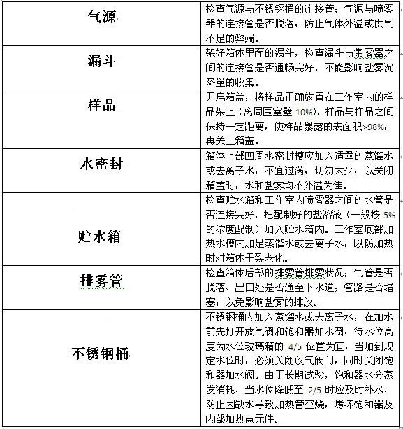 我們都知道,初次使用鹽霧試驗箱有很多講究,更是要做好十足的準備工作。那么,究竟在啟動鹽霧試驗箱前我們要注意哪些事項,如何做好充足的準備?下表是小編整理的關于鹽霧試驗箱啟動前需做的準備工作,感興趣的朋友不妨一起來看看吧。